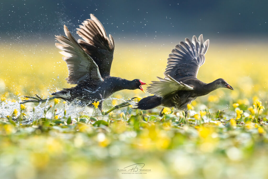 Wir fotografien in verschiedenen Fischteichen und kleinen Seen um eine breite Variation an Bildern zu erhalten. Vorzugsweise mit einem Gimbal oder Videoneiger wird die Kamera im Floating Hide sicher montiert. Links und recht auf den Schwimmkörper gestützt gehen wir langsam durchs Wasser. Das schwimmende Versteck ist kein Boot, deshlab kann man nicht darauf sitzen. Für die Fortbewegung im Wasser eignet sich am Besten eine gut passende Wathose oder alternativ einen Trockenanzug, falls Sie soetwas besitzen. Im Fall der Wathose empfiehlt es sich, eine Trainingshose oder lange Unterwäsche zu tragen, um Druck- und Reibestellen an den Beinen zu vermeiden. Vor der ersten Fotorunde im Wasser gibt es natürlich eine ausführliche Einweisung, damit Sie sich sicher durchs Wasser bewegen können und die Tiere ungestört bleiben. Der Zeitpunkt der Tour ist ideal gewählt, um die besten Bedingungen zu ermöglichen. Mit etwas Glück können wir schon einige Jungtiere und ihre Eltern bei deren Aufzucht und Fütterung beobachten. Wie immer in der Wildlife-Fotografie kann natürlich keine Garantie gegeben werden, dass alle möglichen Tierarten vor unserer Kamera auftauchen.